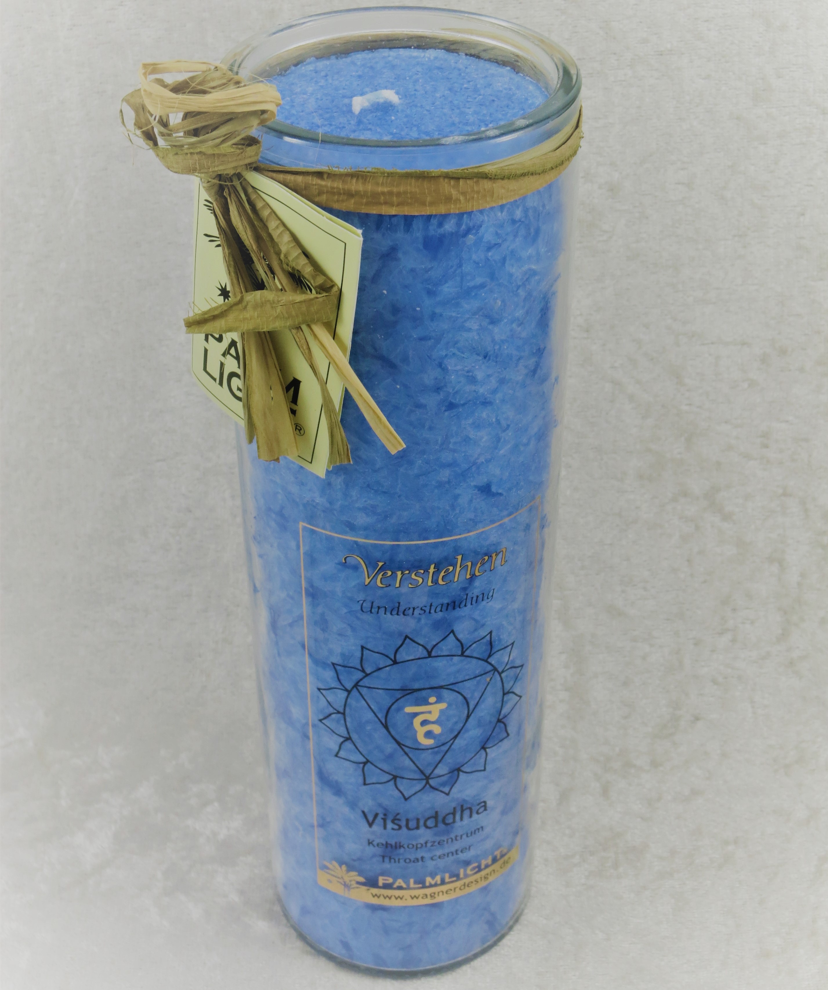 Chakra Kerze / Windlichter, Visuddha-Chakra, hellblau, das Kehlkopf-Zentrum steht auch für Äther, Raum, für das Hören und für die Farbe Blau.