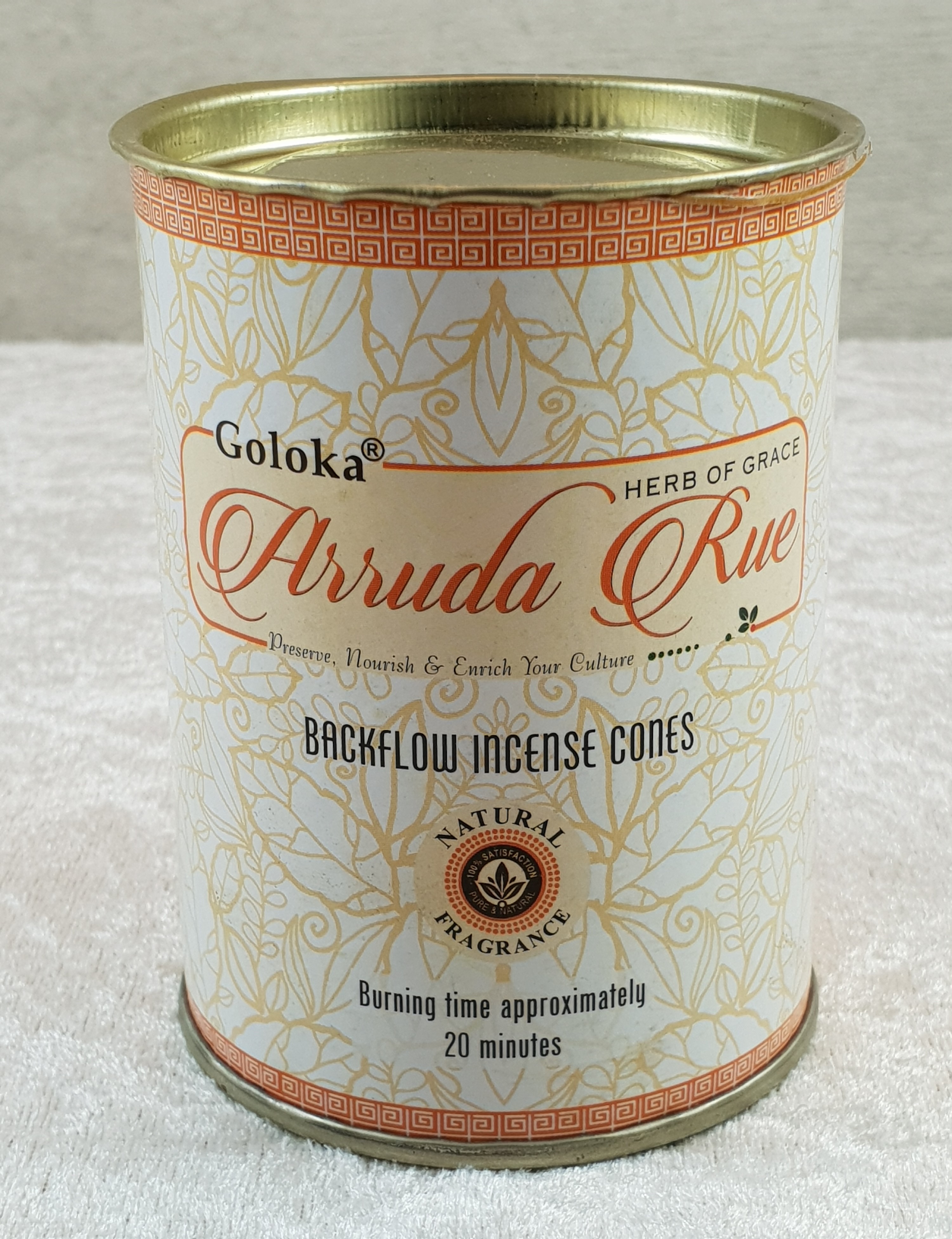 Goloka® Rückfluß-Räucherkegel in der Dose, Duftnote: Arruda Rue frisch würzig, krautiger, süsslicher Duft, 24 Stück pro Dose, Brenndauer je Kegel ca. 20 Minuten