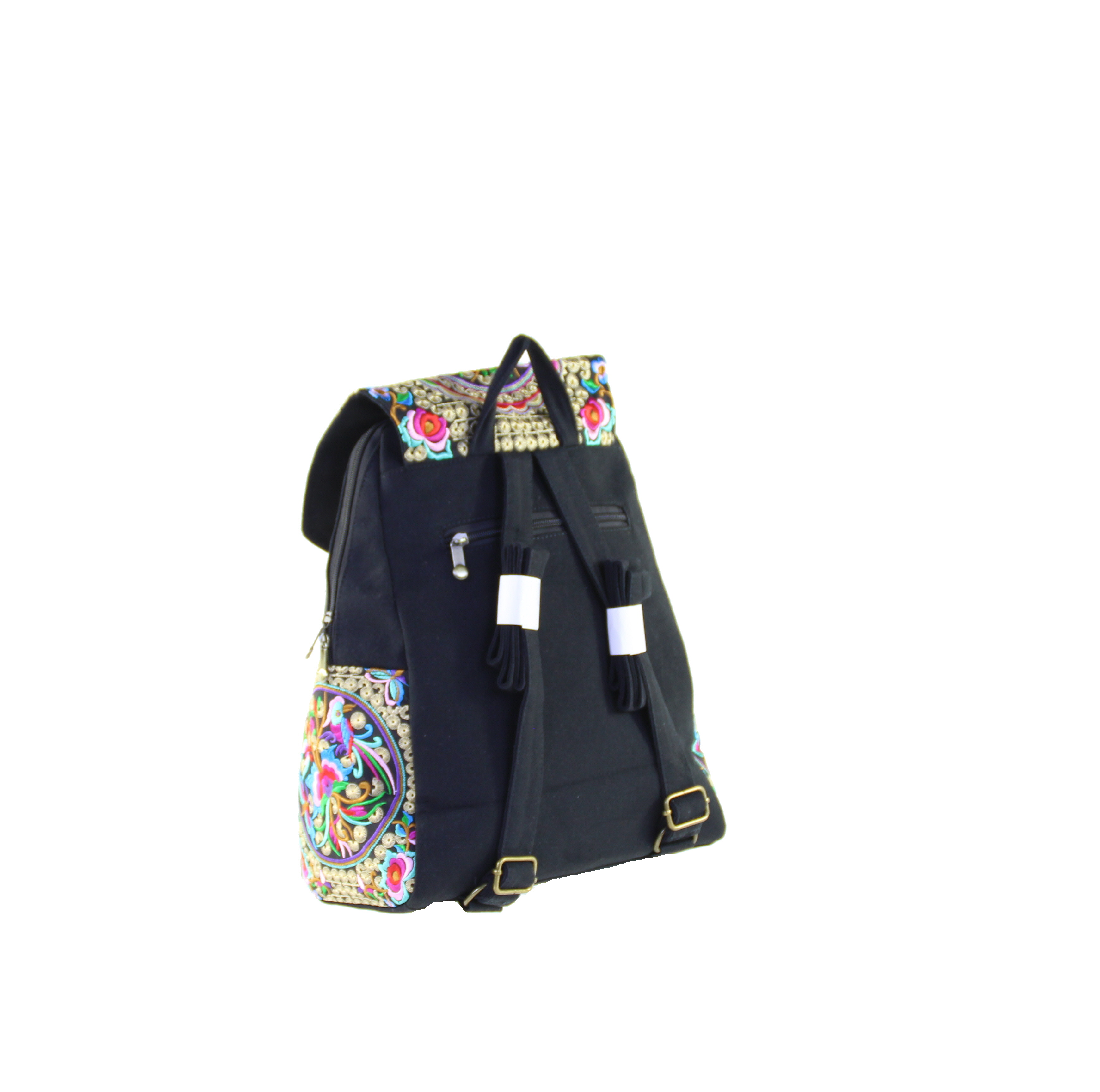 Rucksack, Backpack, Wildflower, Ethnic Embroiderdery, Wildflower, der Rucksack hat einen Magnetverschluß darunter befindet sich ein Reißverschluss. Er hat super viel Stauraum. Innen an der Seite, ist der Rucksack mit einem weiteren Reißverschlussfach ausgestattet. Der Rucksack hat außen auf der Rückseite, unterhalb der Schultergurte, ein Reißverschlußfach. Größe 35 x 10 x 27 cm. Farbe black mult. Die Taschenkollektion Ethnic Embroiderdery inspiriert durch die traditionelle indische Stickerei voller Farben. Material Canvas bestickt, Innenfutter schwarz 100% Baumwolle. Taz Trade