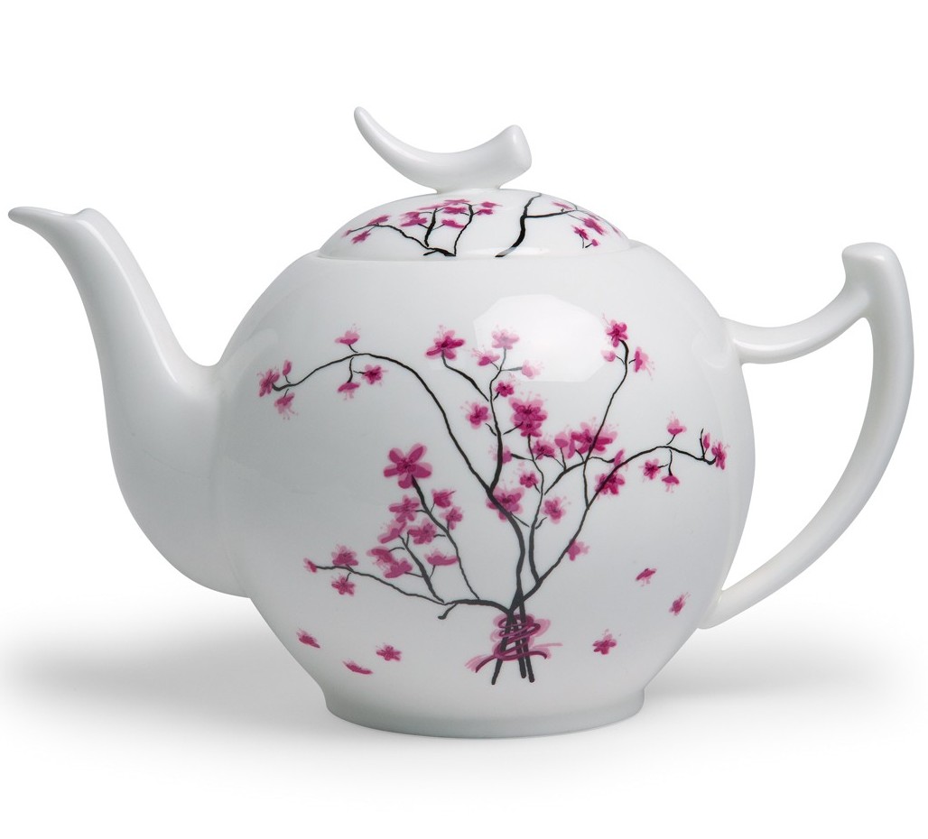 Teekanne Cherry Blossom, TeaLogic, für 1,5 l, Bone China Porzellan. Ein wunderschönes Design zauberhaft und leicht, hauchzarte Kirschblüten, umwunden von einem roten Band.